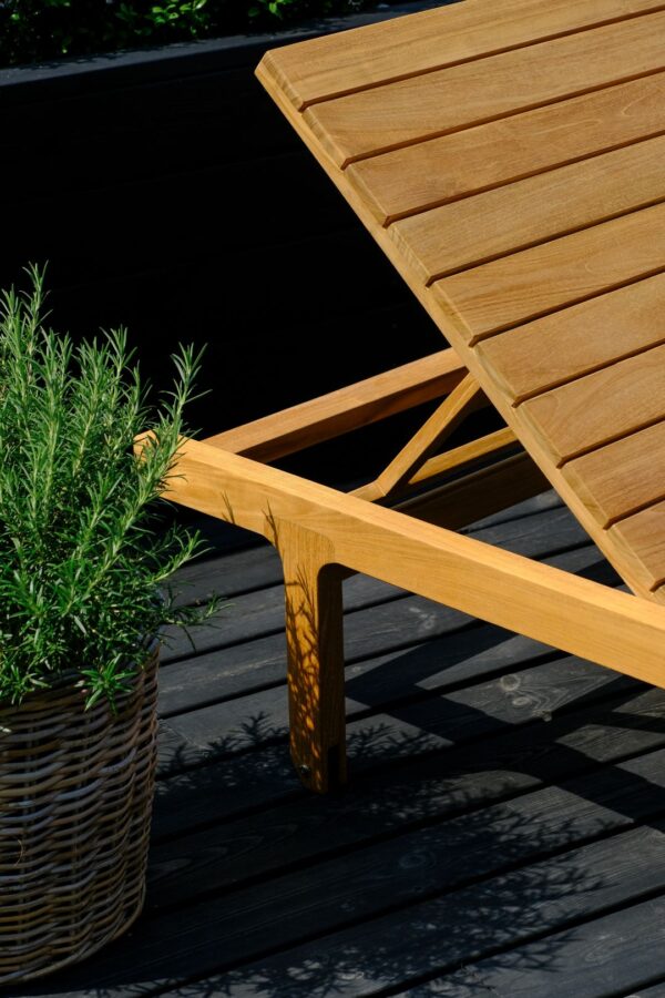 Boca solvognen er udformet som et eksklusivt udendørs møbel i teaktræ, der forener design, komfort og holdbarhed på fornemmeste vis. Den justerbare ryg tilbyder 4 behagelige positioner, så du kan tilpasse din soloplevelse. Med diskrete hjul, smukt integreret i solvognens ben, kan du nemt flytte den rundt og finde den perfekte plads i haven eller på terrassen. Solvognen imponerer også med sin ekstra bredde og kan let fungere som en smuk daybed.