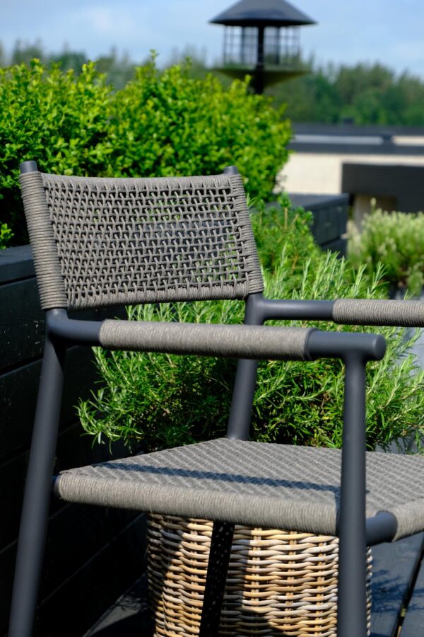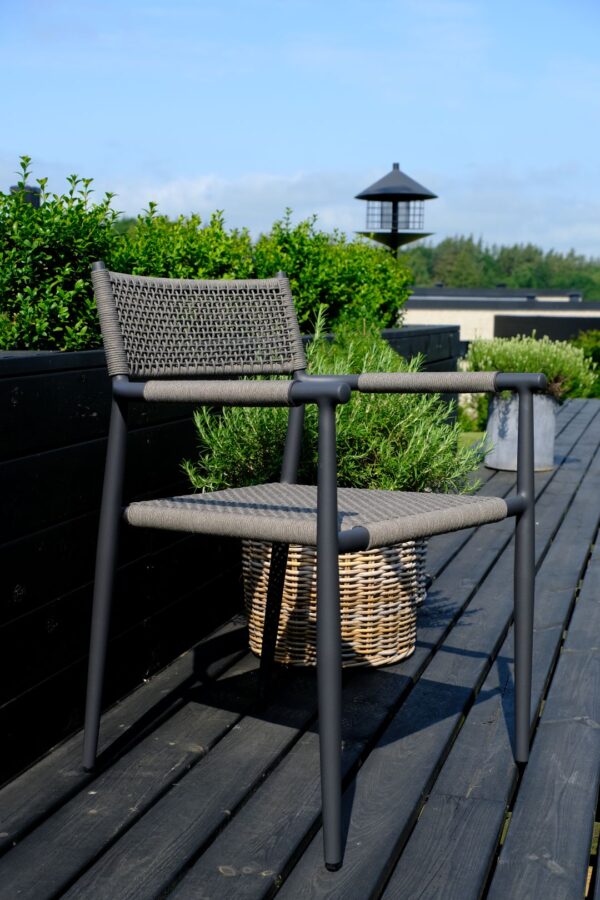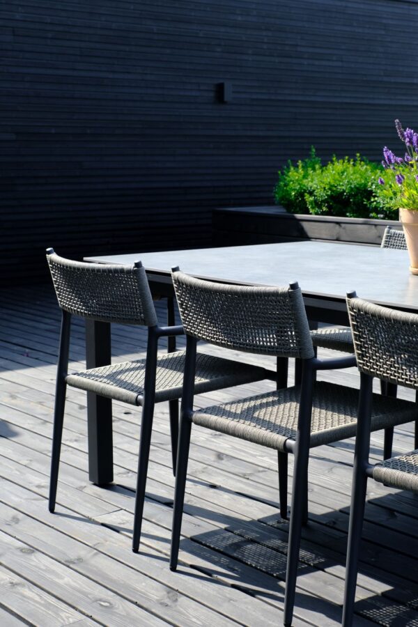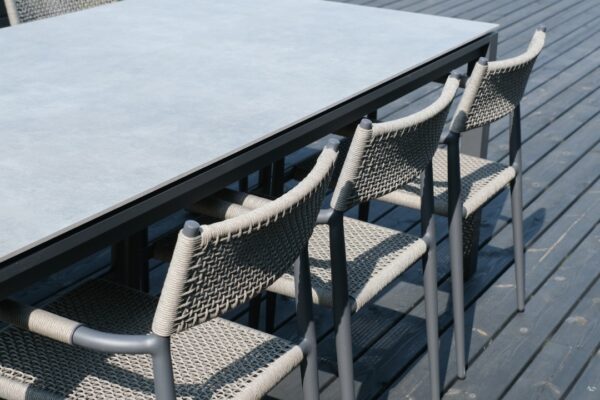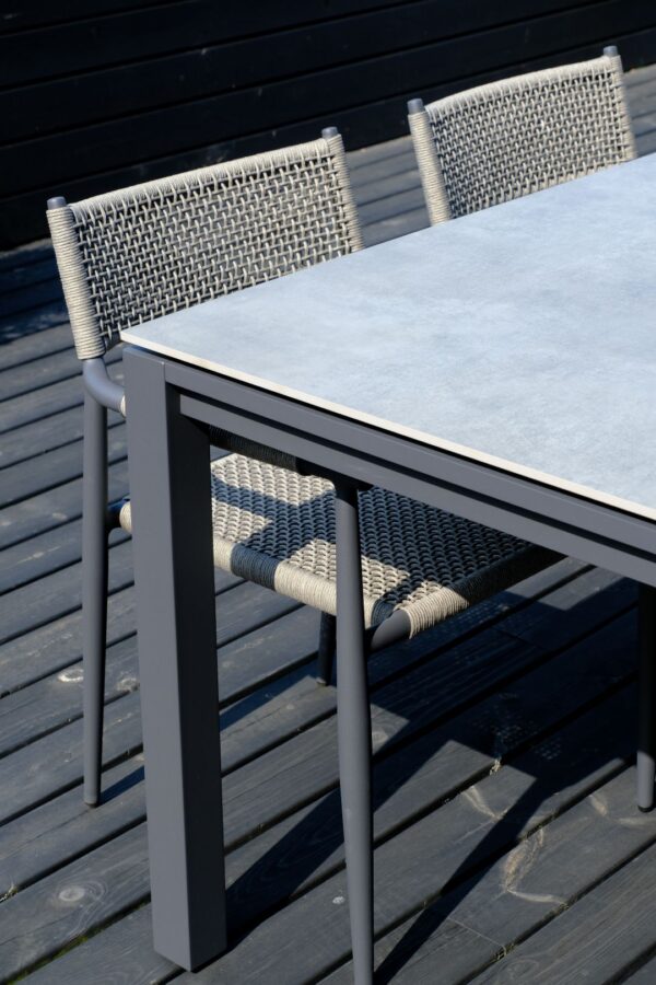 Paso havesættet består af 6 havestole og 1 havebord. Havebordet er fremstillet i pulverlakeret aluminium og har en uopslidelig keramisk bordplade som er yderst nem at vedligeholde. Den smukke Paso havestol er fremstillet i pulverlakeret aluminium med sæde og ryg i et smukt håndflettet olefin reb som er vejr og uv bestandig. Paso havesættet er produceret i den bedst tænkelige kvalitet, og her er du sikret havemøbler med lang holdbarhed og minimal vedligeholdelse.